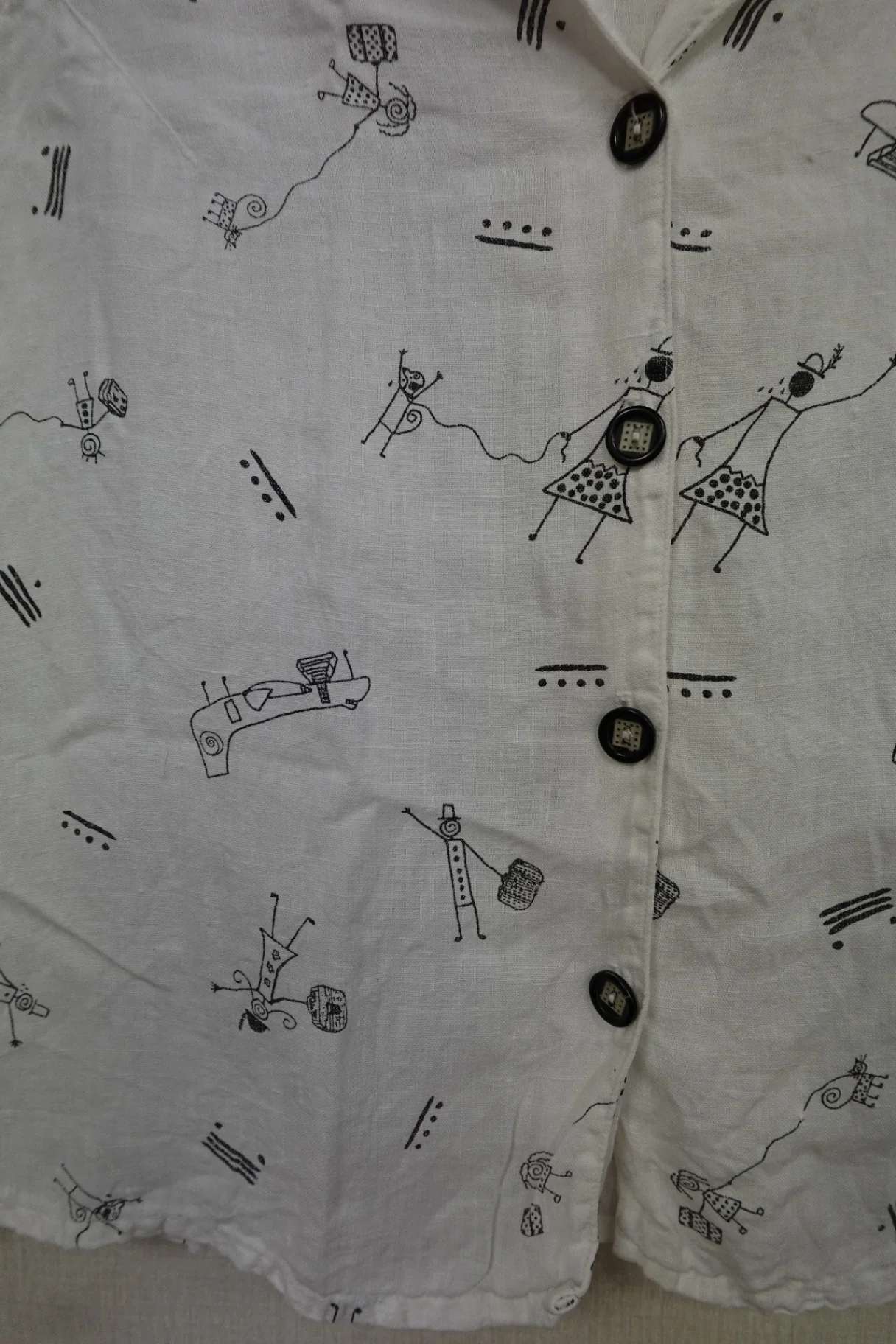 This sleeveless linen vest features a playful black and white print of vintage-style illustrations, adding a quirky touch to casual outfits. Its lightweight fabric makes it perfect for warm weather, and the button-up front adds a classic element. Layer it over simple tees or blend it into statement accessories for a unique, artsy vibe.